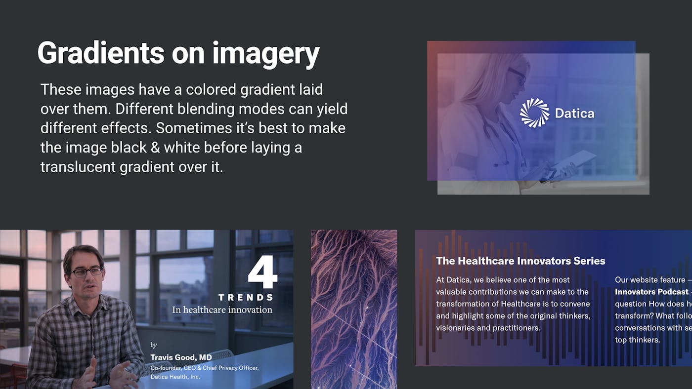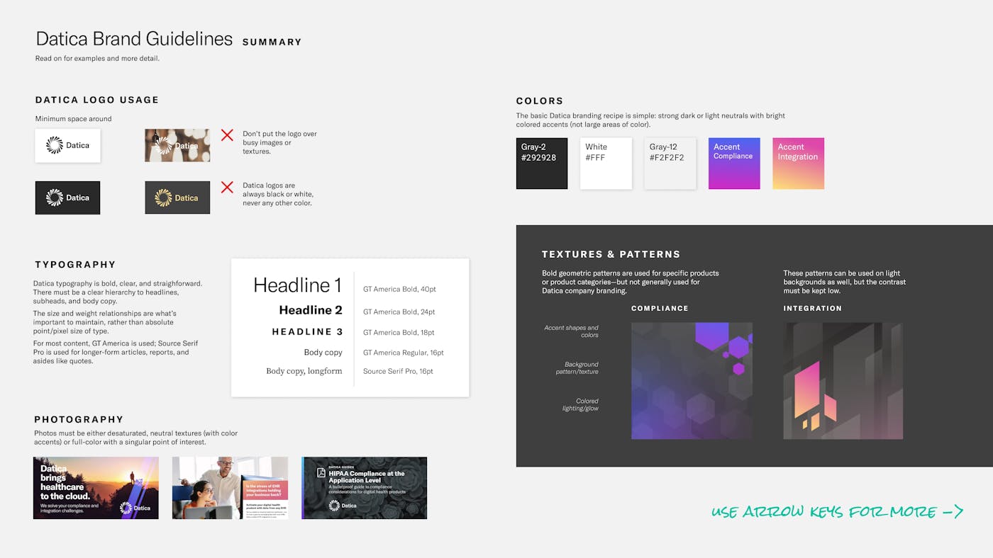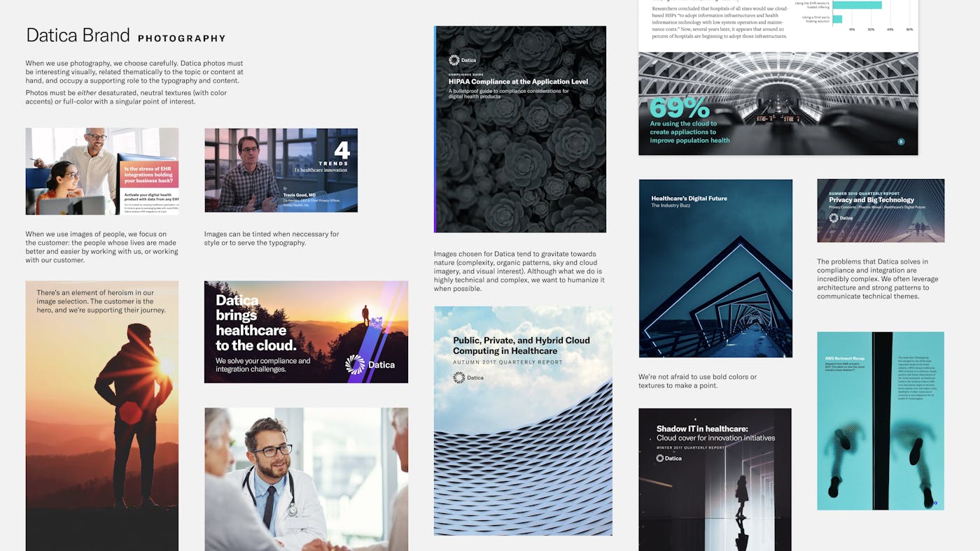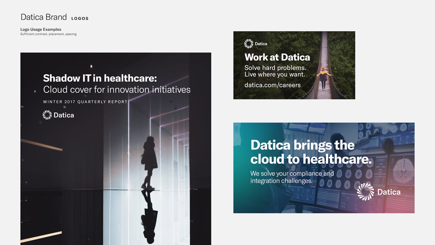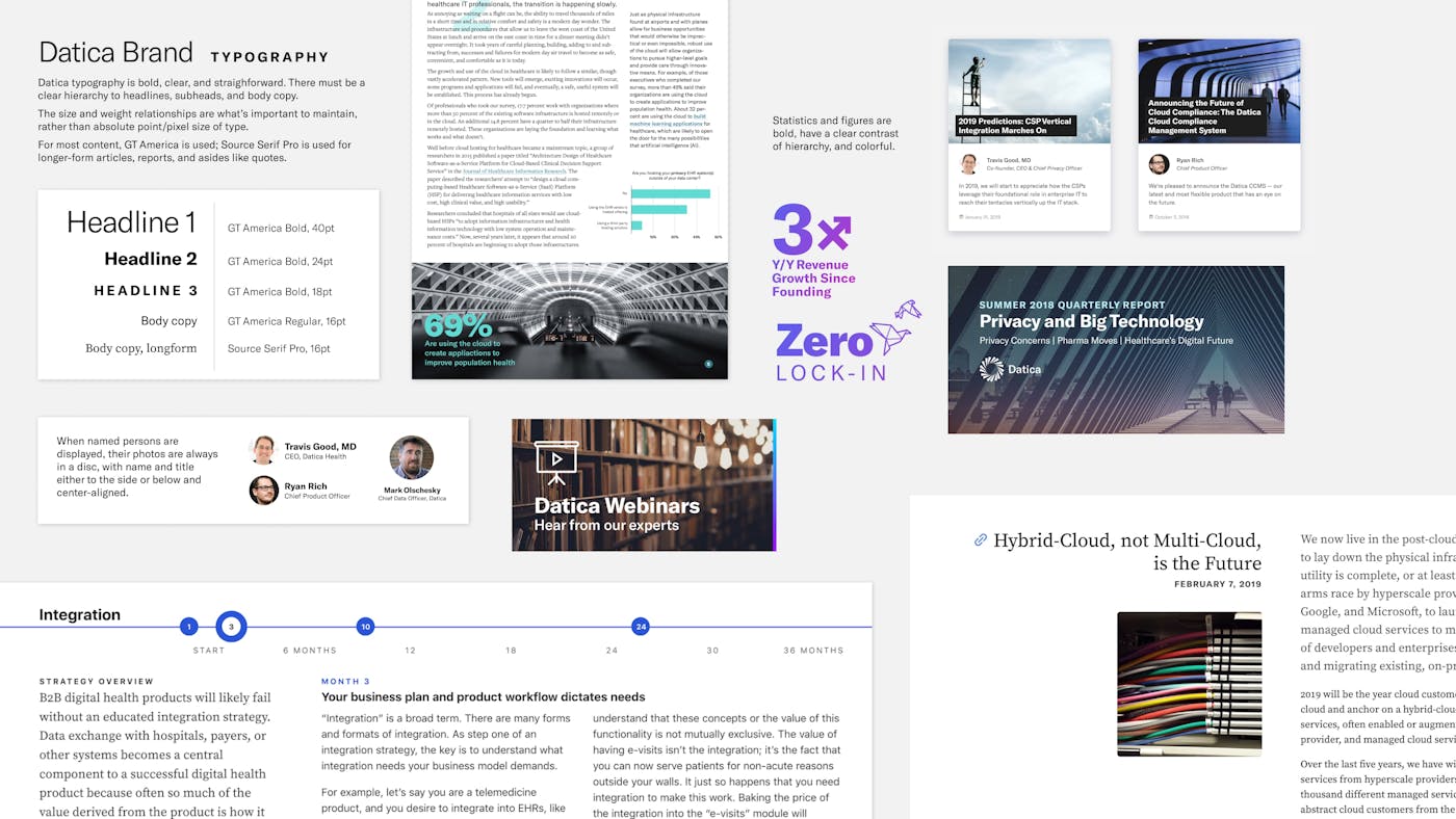 As the design lead at Datica, I supported the marketing team by building out the entire public-facing brand, including a new website, magazine-style print guides and reports, trade show booths and ads, presentations, animations and video.