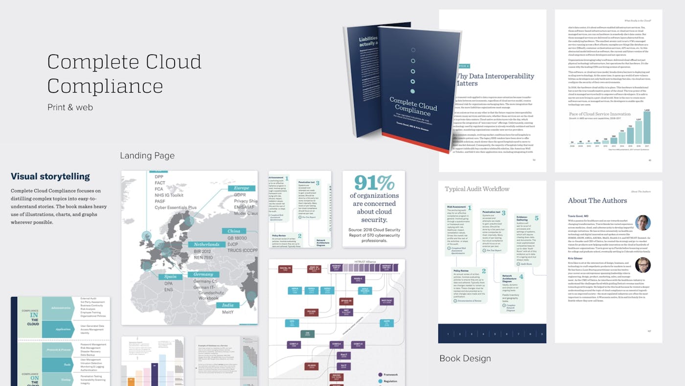 Print projects (though delivered as PDF) included magazine-style guides and reports, and doing the primary layout, typography, and site for the Complete Cloud Compliance book. These were key components of the content marketing strategy; they drove traffic from Google, live events, and email campaigns through our Hubspot sales automation system.
