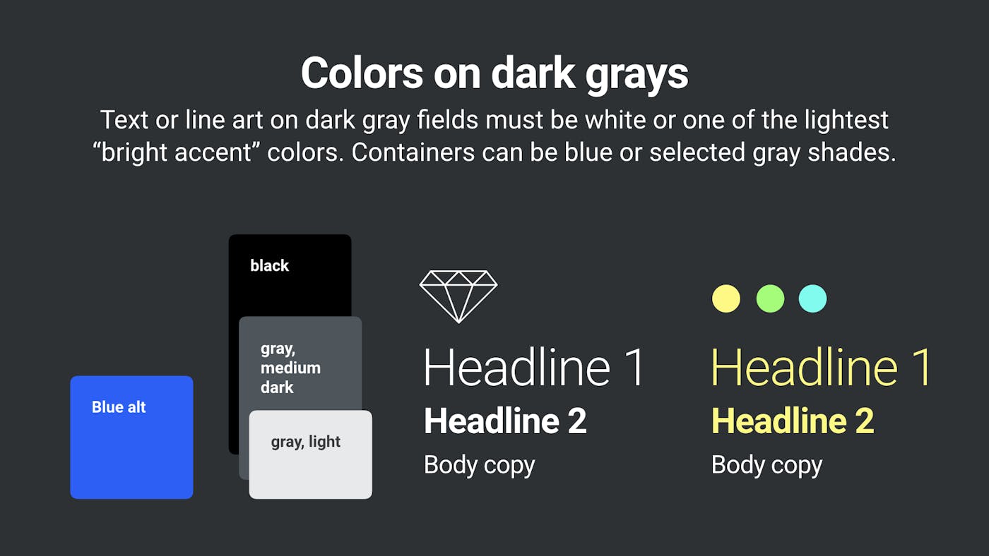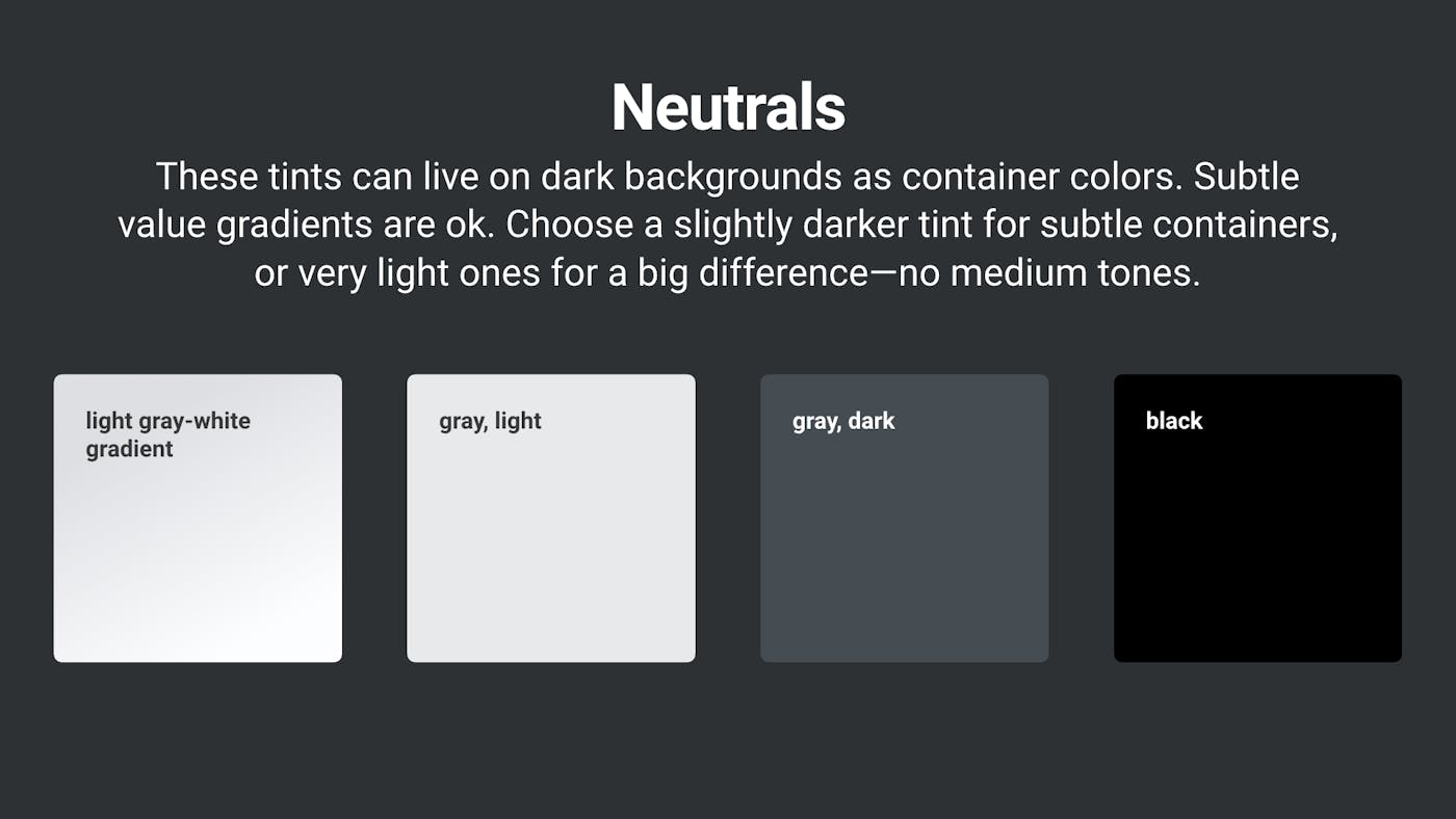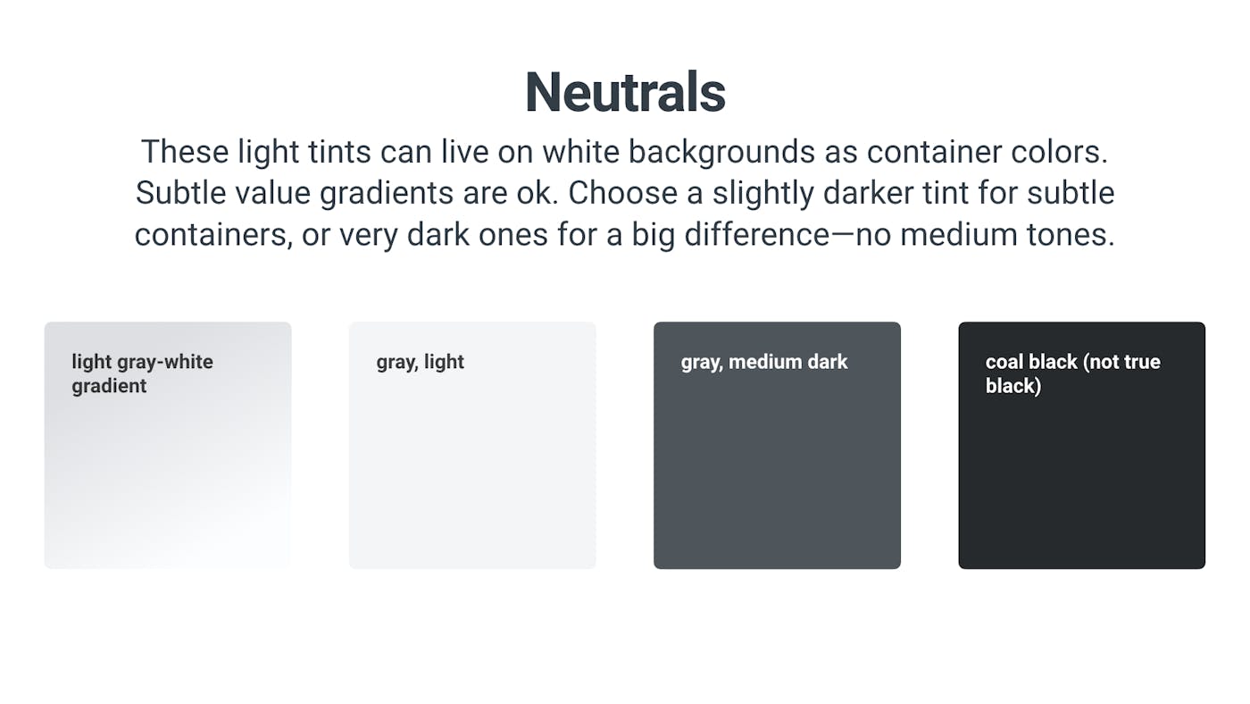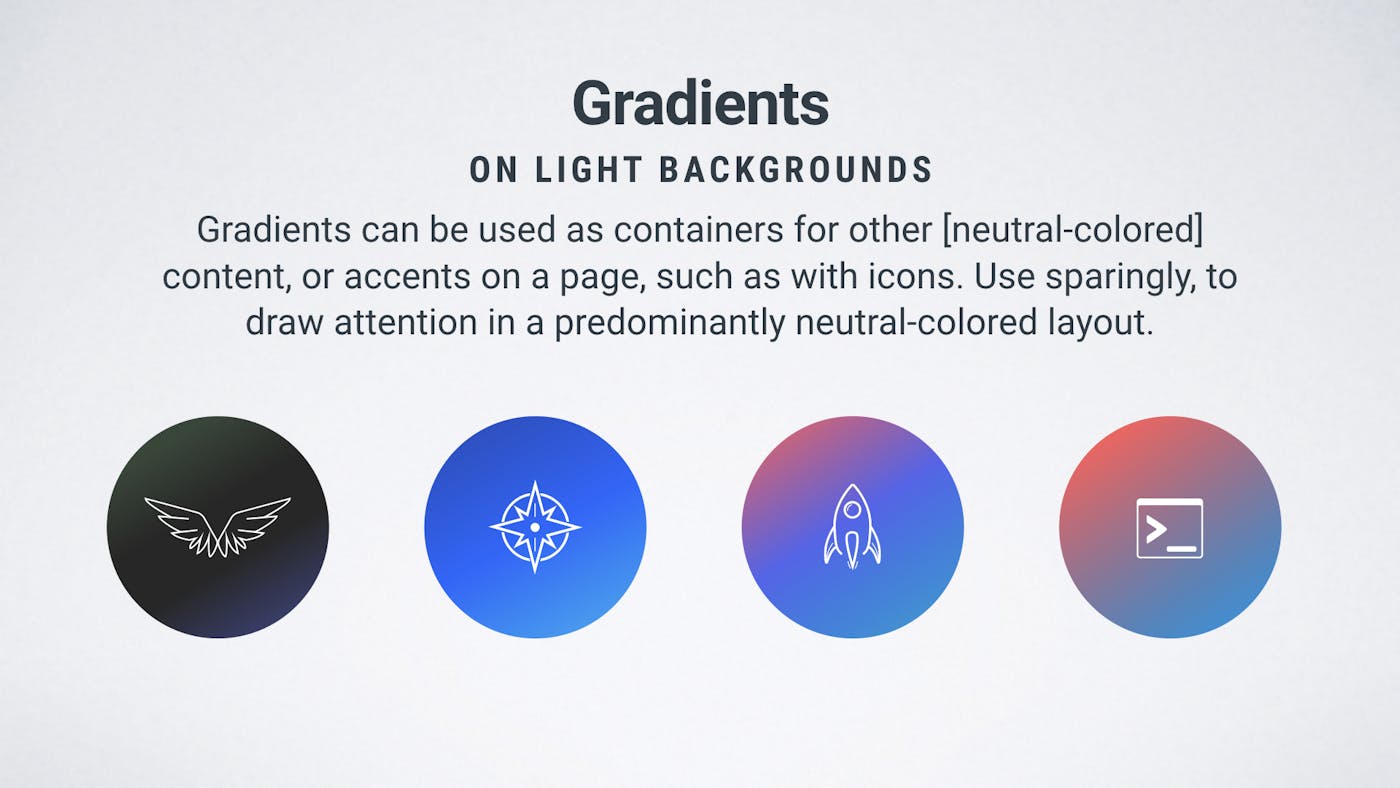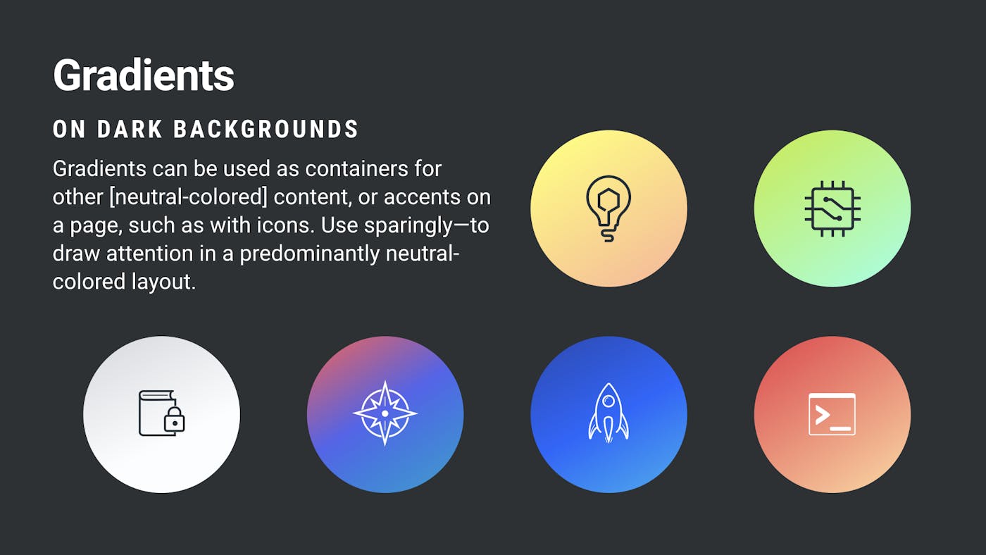 Neutrals occupy the majority of the negative space. Bright accent colors or gradients are used as accents. The gradients are associated with different products or product categories. When accent colors and shapes are used over dark images, “glow” lighting is used to give a sense of depth and space.