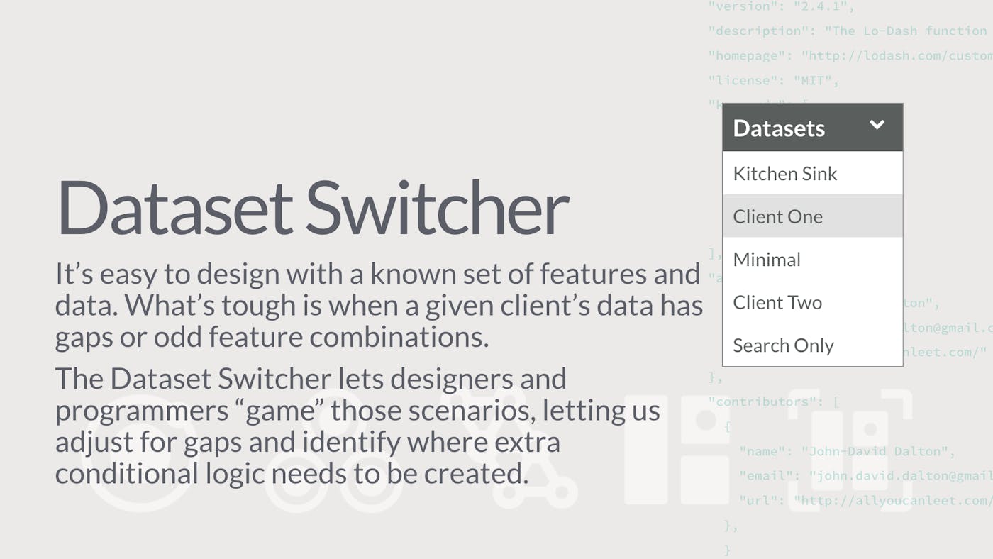 We also laid the foundation for advanced design tools that were to follow: rapid prototyping with actual, production ember components; integrating live datasets (which varied greatly per customer, and often had massive gaps or surprises within), and theming tools (which would let us explore various white-label scenarios and develop theming tools for customers). The intent was to create a platform for constructing production-ready Ember components that would, when moved to the main product (called UICore), be re-consumed by the pattern library. This would let us shorten or collapse the gap between prototyping and production—accelerating product development and improving alignment across teams.